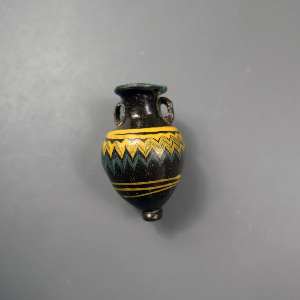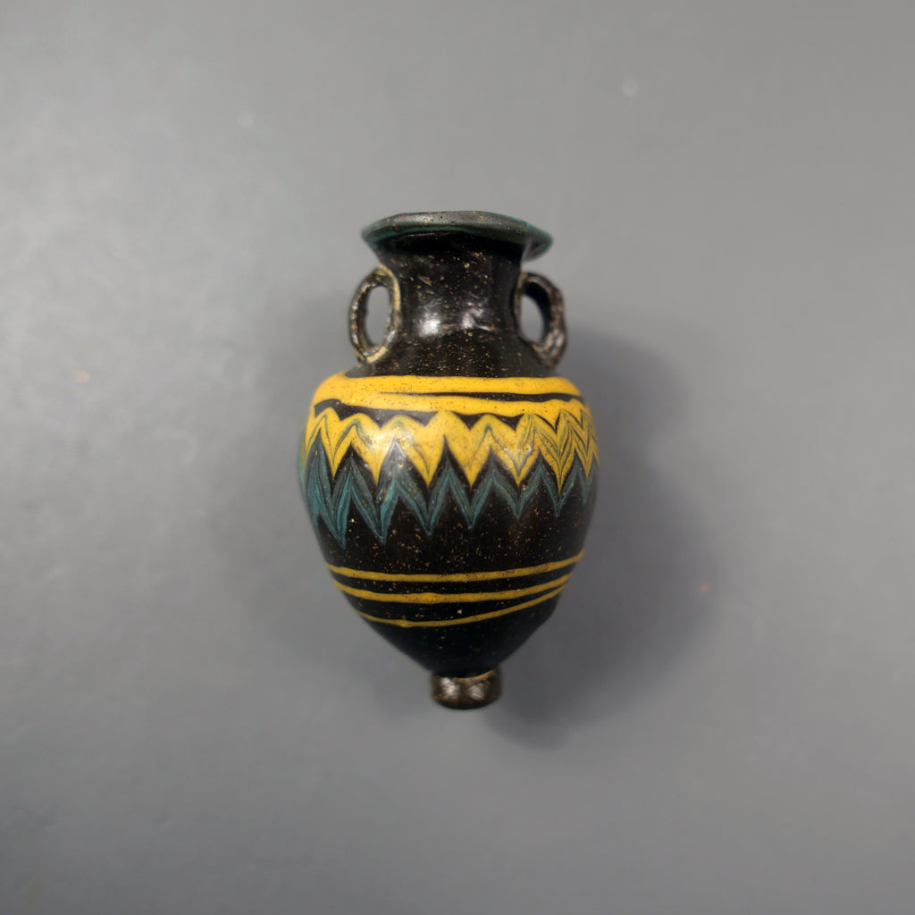 Petite amphorisque en pâte de verre noire, ornée d'un motif de zigzag jaune et turquoise.