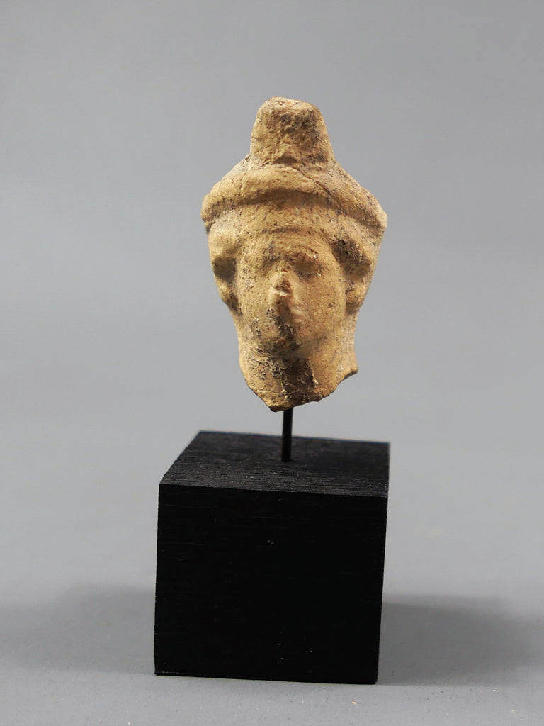 Tête de statuette féminine, les cheveux coiffés en bandeaux surmontés d'un petit polos posé sur un coussinet et orné d'une palmette.
